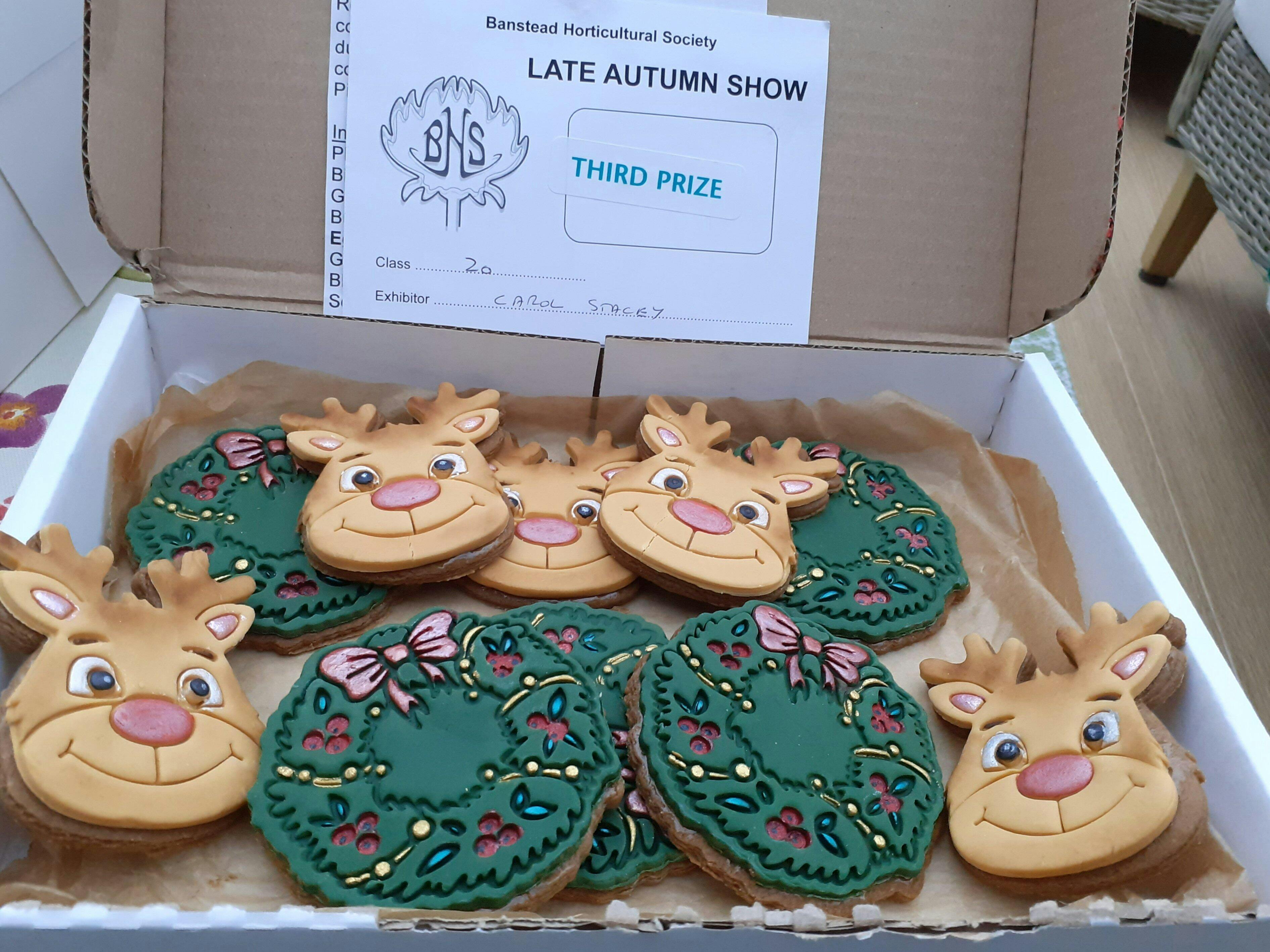 I received the Christmas wreath cutter and stamp as a free gift when I ordered a bundle of goodies from LissieLou. I've used it recently to cut out gingerbread biscuits and make a decorated topper. I entered the biscuits in my local Horticultural society Autumn show on Saturday and was pleased to be awarded a 3rd prize, the decoration was commended I just need to work on the snap of my biscuit. I would recommend the stamp, you can bling it up as much as you like really, I chose to paint mine but you could use sprinkles or just leave it plain. (The rudolph biscuits were cut using a combocutter.)
