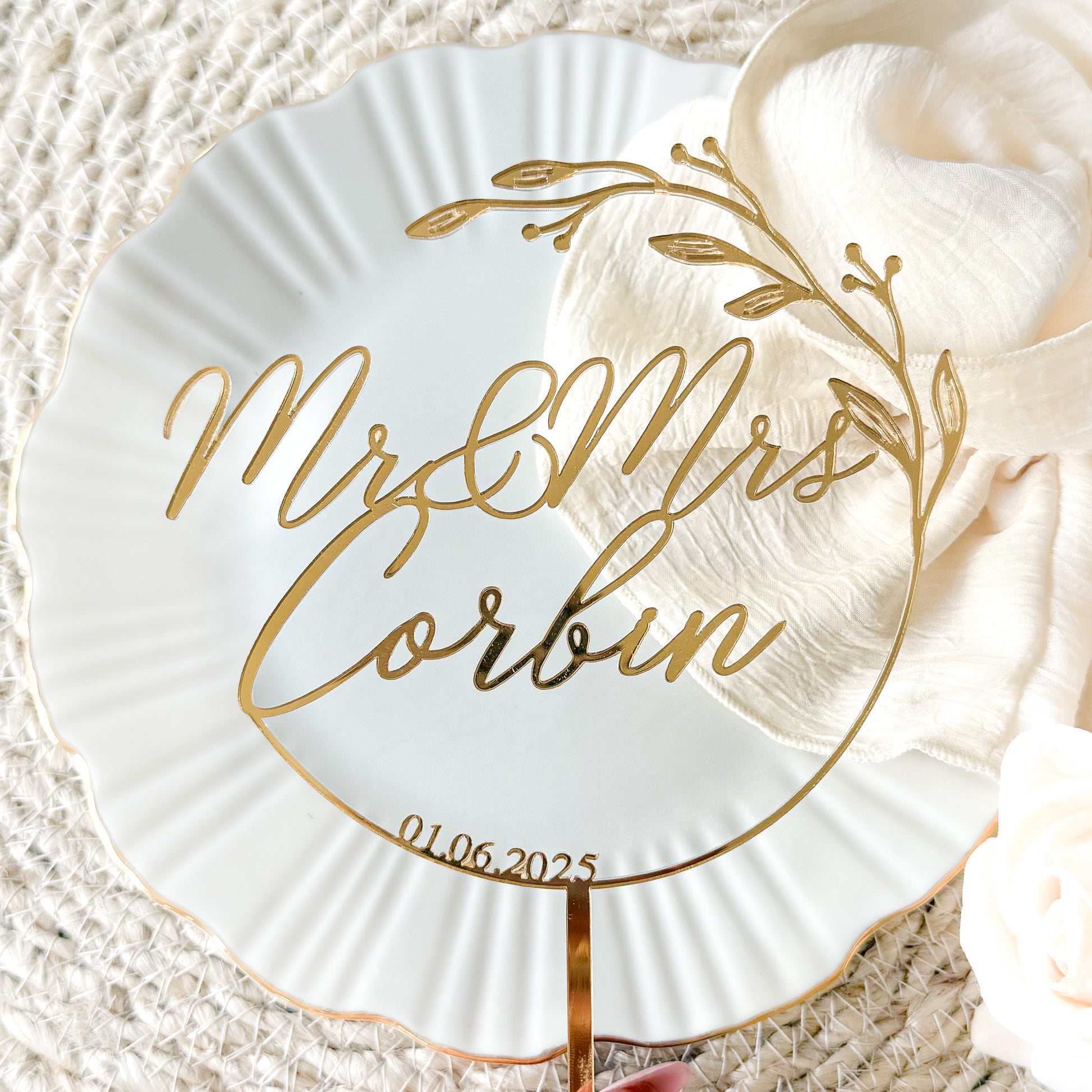 Personalised Gold Mirror Acrylic Wedding Cake Topper – Mr & Mrs + Surname & Wedding Date – Botanical Foliage Design